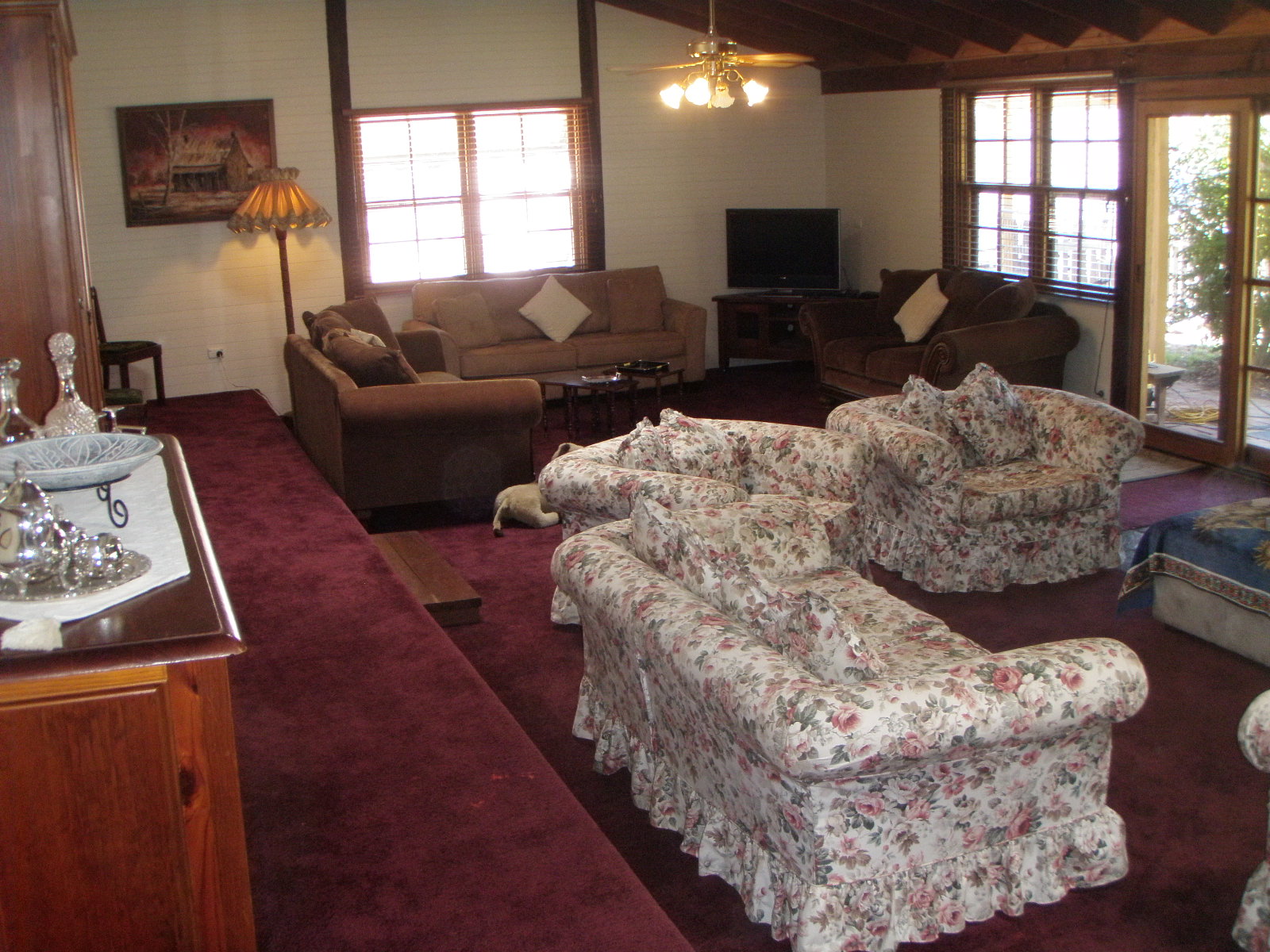 The lounge and dining area is a later edition from the 1970’and was built onto the front verandah of the Wine Palace. This is the raised step that goes across the front of the bedrooms. There was also a walkway joining the house behind, but this was removed long ago.